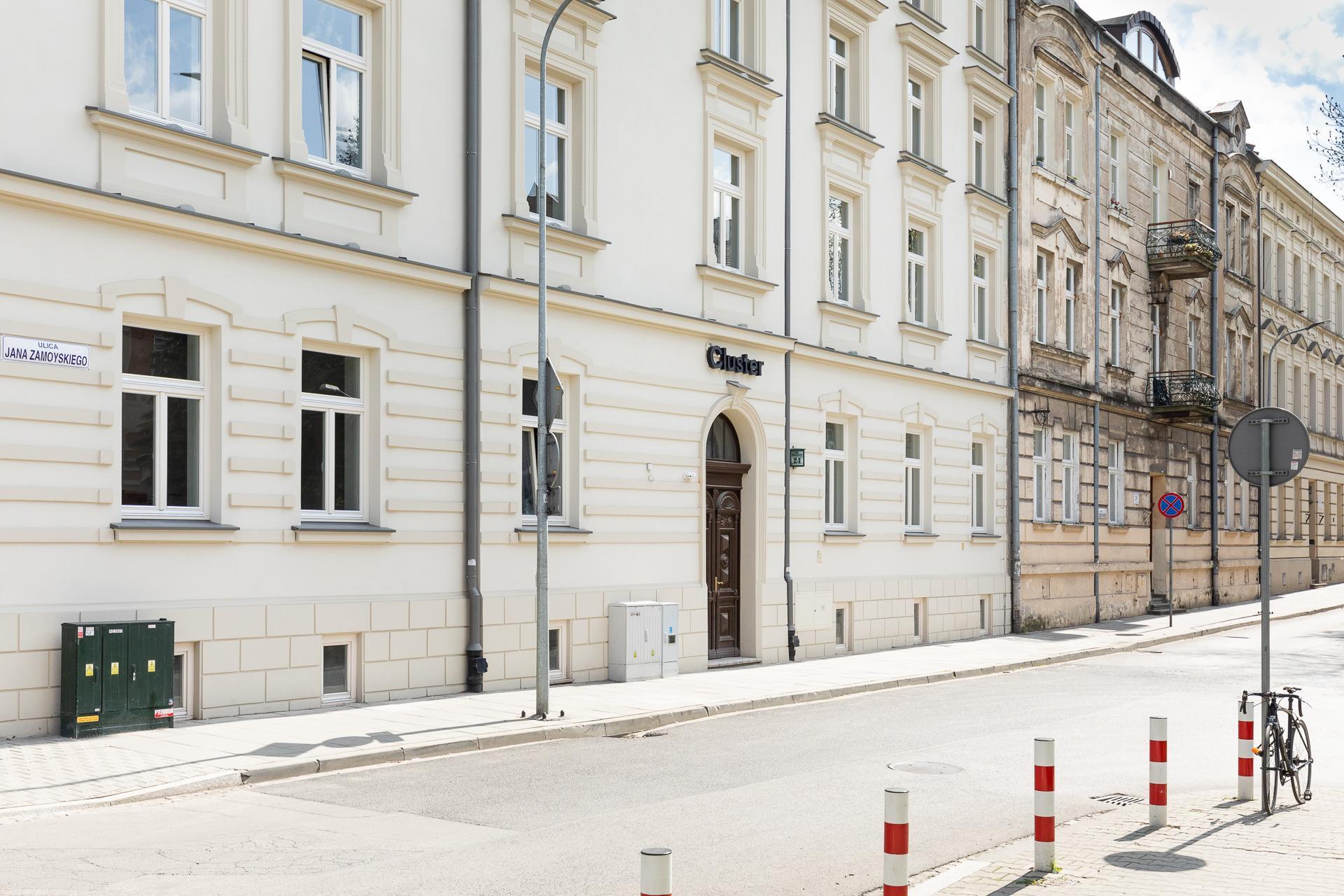 Cluster Cowork – Stare Podgórze is a modern coworking office space located in a renovated townhouse from 1892 at 24 Zamoyskiego Street in Kraków. The building offers five floors and about 1,250 sqm of office space, including serviced offices, coworking desks, meeting rooms, fully equipped kitchens, relaxation zones, and a reception area. The high standard includes ergonomic furniture, fast fiber-optic internet, air conditioning, ventilation, monitoring, and 24/7 security. There is a restaurant on the ground floor, and the building is pet-friendly. The space is flexible and suited to the needs of freelancers as well as larger teams.